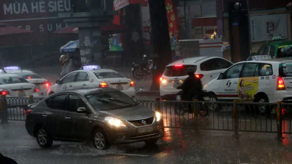 Cơn mưa vào khoảng 15 giờ chiều 10-6 còn kèm theo dông, gió giật, trời tối đen. Nhiều người dân lưu thông trên đường gặp khá nhiều khó khăn, một số khu vực còn diễn ra tình trạng ngập.