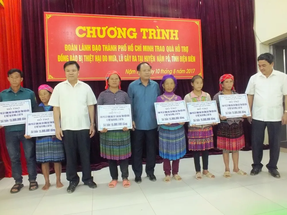 Ngay sau đó, Phó Bí thư Thường trực Thành ủy TPHCM cùng đoàn công tác đã tới thăm hỏi, động viên và chia sẻ những mất mát do thiên tai gây ra đối với người dân huyện Nậm Pồ cách thành phố Điện Biên Phủ hơn 150km.