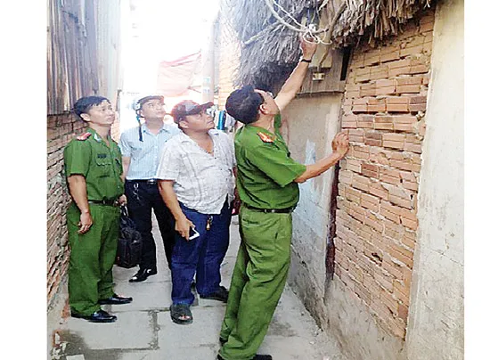 Cảnh sát PCCC kiểm tra, nhắc nhở người dân thực hiện tốt các quy định an toàn PCCC tại một khu dân cư ở quận 7.