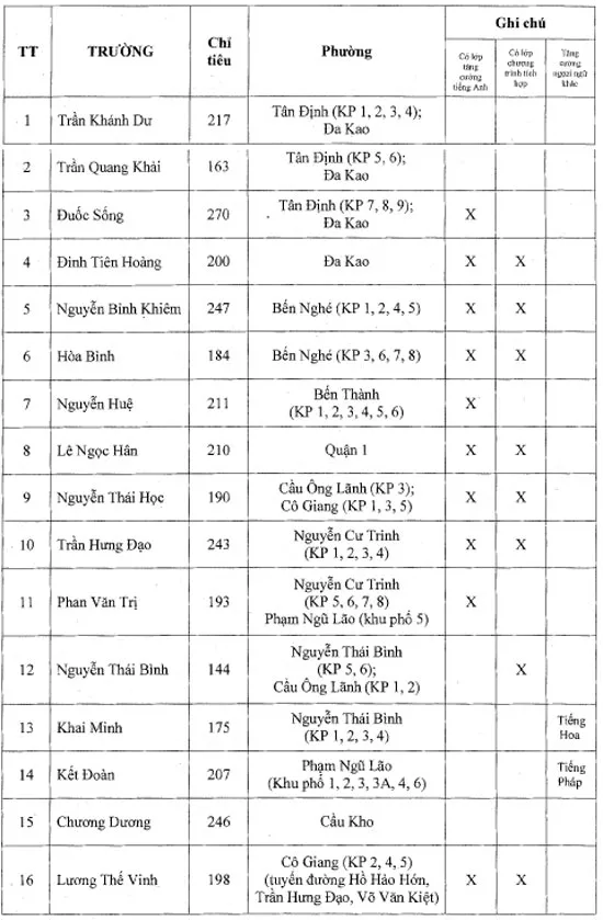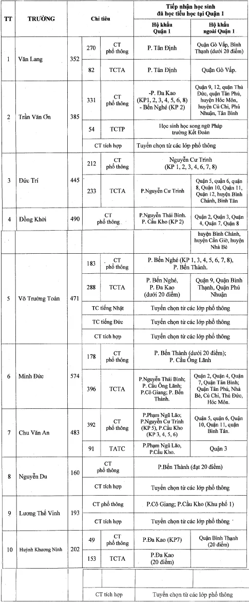Đối với lớp 1, học sinh được tuyển theo giấy gọi đi học lớp 1 tại phường cư trú. UBND các phường sẽ có kế hoạch thông báo cho người dân nhận “Giấy gọi đi học lớp 1” từ ngày 21-6 đến ngày 27-6. Trường hợp học sinh có hộ khẩu tập thể, mới chuyển hộ khẩu hoặc tạm trú dài hạn từ tháng 5-2014 đến nay sẽ được xem xét phân bổ vào các trường tùy theo từng trường hợp cụ thể. Các em diện tạm trú KT3 phải có hộ khẩu gốc ở tỉnh để đối chiếu. Các trường tiểu học nhận hồ sơ diện trong tuyến (gồm tất cả trẻ sinh năm 2009, có hộ khẩu thường trú hoặc hoặc tạm trú dài hạn (KT3) tại quận 1) từ ngày 1-7 đến ngày 7-7. Đối với diện ngoài tuyến, các trường tiểu học phát và nhận hồ sơ từ ngày 8-7 đến ngày 10-7. Danh sách được công bố ngày 31-7.