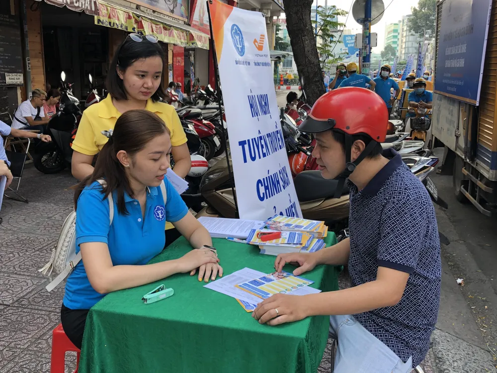 Cán bộ, nhân viên BHXH TPHCM và Bưu điện TPHCM tiếp cận, vận động người lao động tự do tham gia BHXH tự nguyện, BHYT hộ gia đình. Ảnh: THẾ MỸ