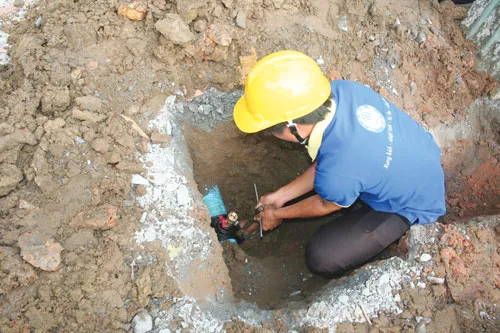 Nhân viên kỹ thuật SAWACO đang sửa ống nước cho người dân.
