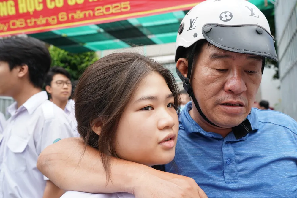 Tại cổng điểm thi Trường THPT Hùng Vương, trưa 7-6, hình ảnh khiến nhiều người xúc động là khi thí sinh Phúc An, học sinh lớp 9/7, Trường THCS Võ Thành Trang (quận Tân Phú) òa khóc khi vừa nhìn thấy ba đang đứng đợi ở cổng trường.