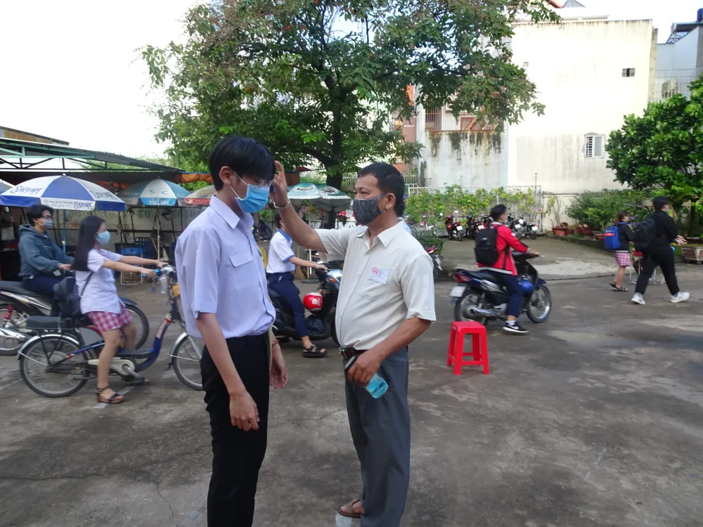 Điểm thi bố trí 3 cán bộ đo thân nhiệt và hướng dẫn thí sinh rửa tay với dung dịch sát khuẩn. Những thí sinh đi xe gắn máy cũng được đo thân nhiệt trước khi vào gửi xe trong sân trường.