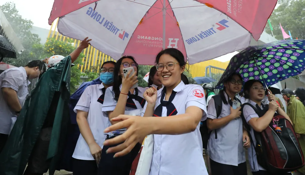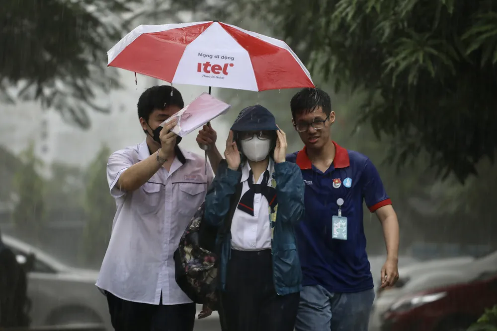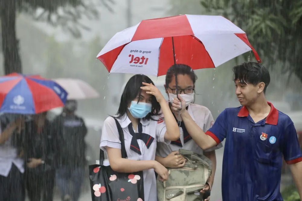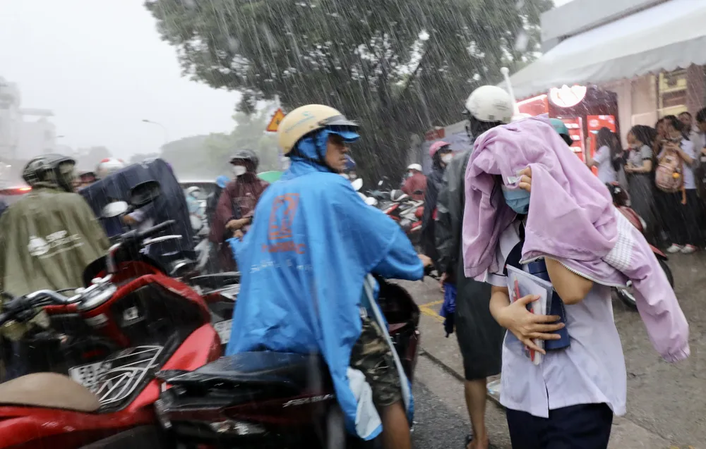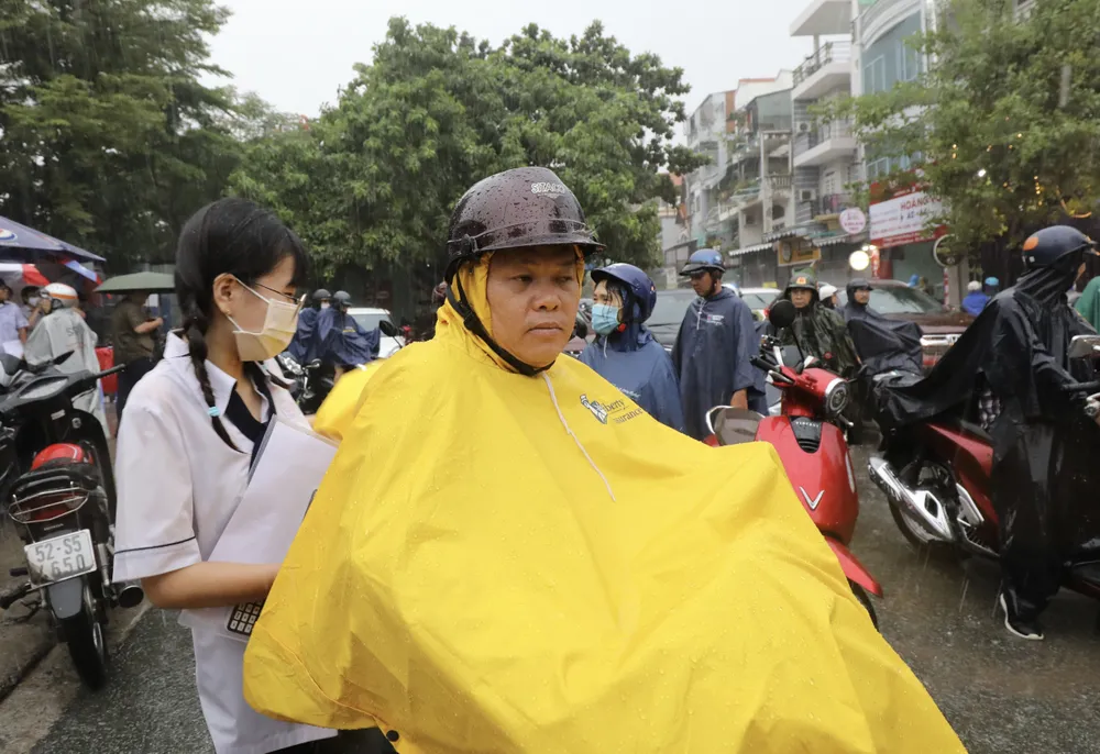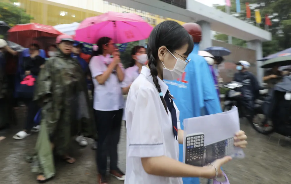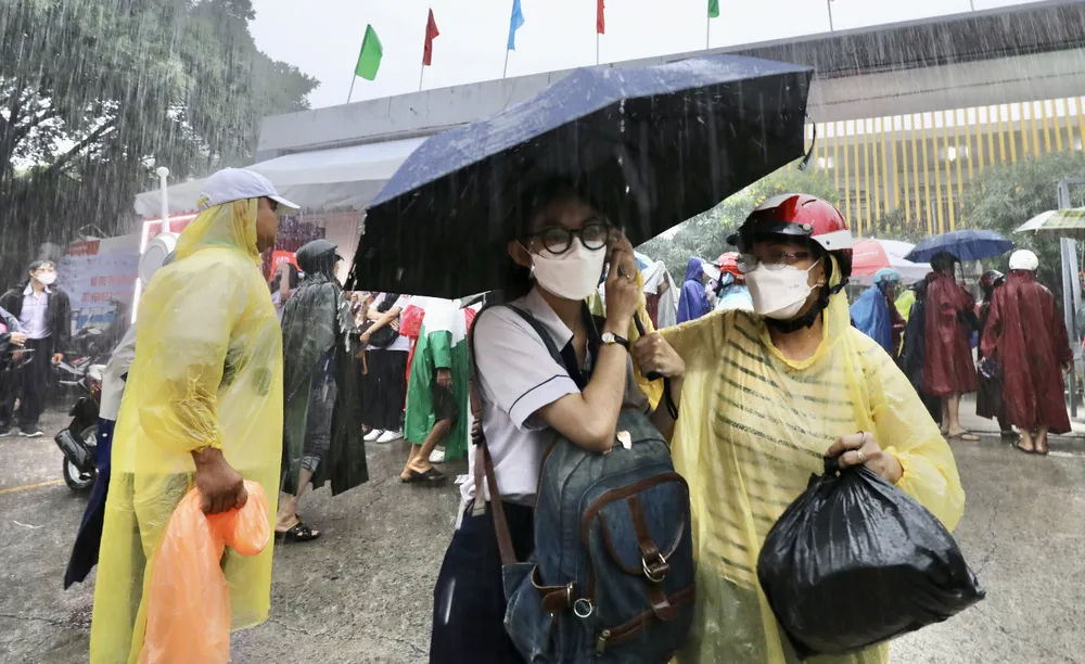 >> Một số hình ảnh thí sinh ra về trong cơn mưa sau giờ làm bài môn Toán tại Trường THPT Gia Định, quận Bình Thạnh. Ảnh: DŨNG PHƯƠNG
