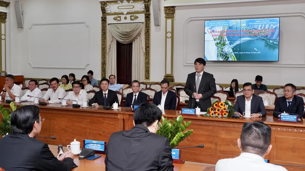 Sáng 4-12, UBND TPHCM tổ chức lễ ký kết biên bản thỏa thuận tài trợ công trình cầu đi bộ qua sông Sài Gòn, kết nối quận 1 với khu đô thị mới Thủ Thiêm. Theo công bố, Công ty Cổ phần Thực phẩm dinh dưỡng Nutifood tài trợ miễn phí toàn bộ kinh phí xây dựng cây cầu có hình lá dừa nước, tổng kinh phí tài trợ ước tính 1.000 tỷ đồng.