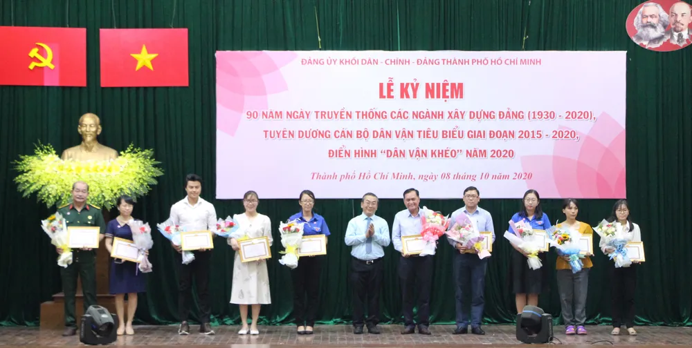 Phó Ban Tuyên giáo Thành ủy TPHCM Tô Đại Phong trao tặng giấy khen cho các điển hình Dân vận khéo năm 2020. Ảnh: MAI HOA