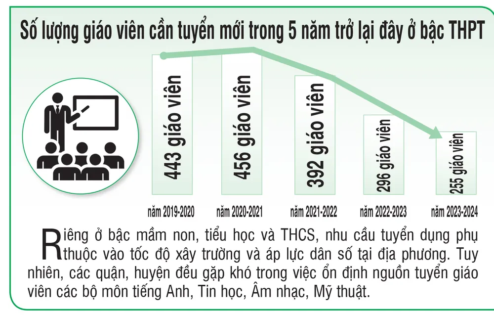Năm học 2023-2024, Chương trình Giáo dục phổ thông 2018 triển khai cuốn chiếu ở lớp 4, 8, 11 và sẽ kết thúc lộ trình triển khai thực hiện ở cả 3 bậc học (gồm tiểu học, THCS, THPT) vào năm học 2024-2025. Thời điểm hiện tại, việc bổ sung nguồn tuyển giáo viên đào tạo chính quy các môn học mới được phòng GD-ĐT các quận, huyện và TP Thủ Đức dự đoán rất khó thực hiện, bởi số lượng sinh viên mới tốt nghiệp ra trường “như muối bỏ biển” so với nhu cầu giảng dạy thực tế ở các trường phổ thông.