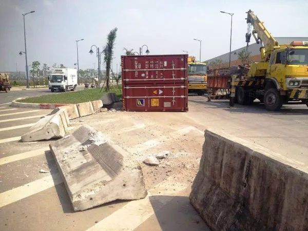 Ngay khi xe container vừa đến đoạn giao với đường D2, phường Phú Hữu, quận 9 thì tài xế cho xe ôm cua để tiếp tục lưu thông. Do cua gấp nên chiếc xe chao đảo rồi lật nhào xuống đường, ủi vào dải phân cách.