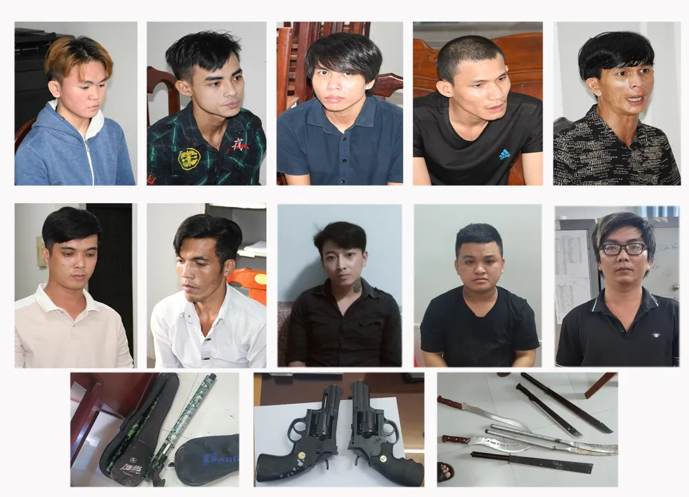 Theo đó, liên quan đến vụ nổ súng dẫn đến chết người xảy ra tại phường 5, TP Trà Vinh (tỉnh Trà Vinh), Cơ quan Cảnh sát điều tra thi hành lệnh bắt tạm giam các đối tượng: Huỳnh Hải Hà (33 tuổi), Huỳnh Văn Chung (19 tuổi), Kiên Ngọc Tuấn (32 tuổi), Mai Tấn Việt (33 tuổi), Quách Tuấn Hải (26 tuổi) cùng ngụ phường 5; Giang Tuấn Hà (17 tuổi), Mai Từ Chiến (23 tuổi), Thạch Hoàn Sa (27 tuổi) cùng ngụ phường 9; Kim Se Wane Tha (33 tuổi) ngụ phường 1, TP Trà Vinh; Phạm Văn Tú (25 tuổi) ngụ xã Nguyệt Hóa, huyện Châu Thành.