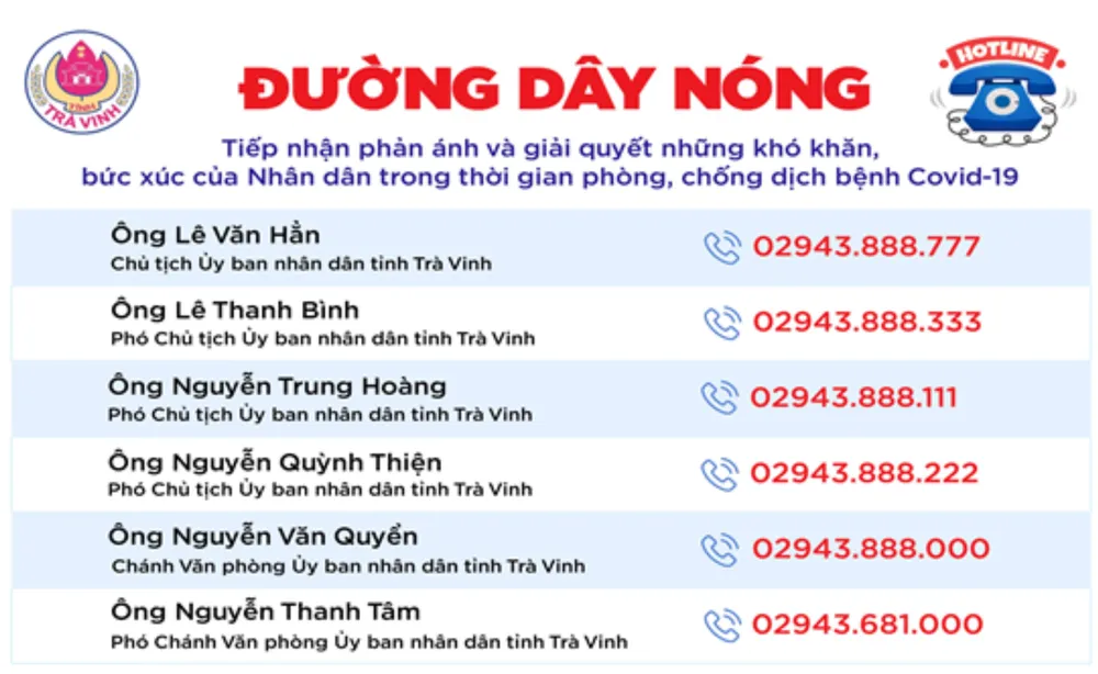 Đường dây nóng sẽ tiếp nhận những bức xúc, khó khăn thực sự của người dân là số điện thoại của Chủ tịch, Phó Chủ tịch UBND tỉnh, Chánh Văn phòng và Phó chánh Văn phòng UBND tỉnh Trà Vinh.