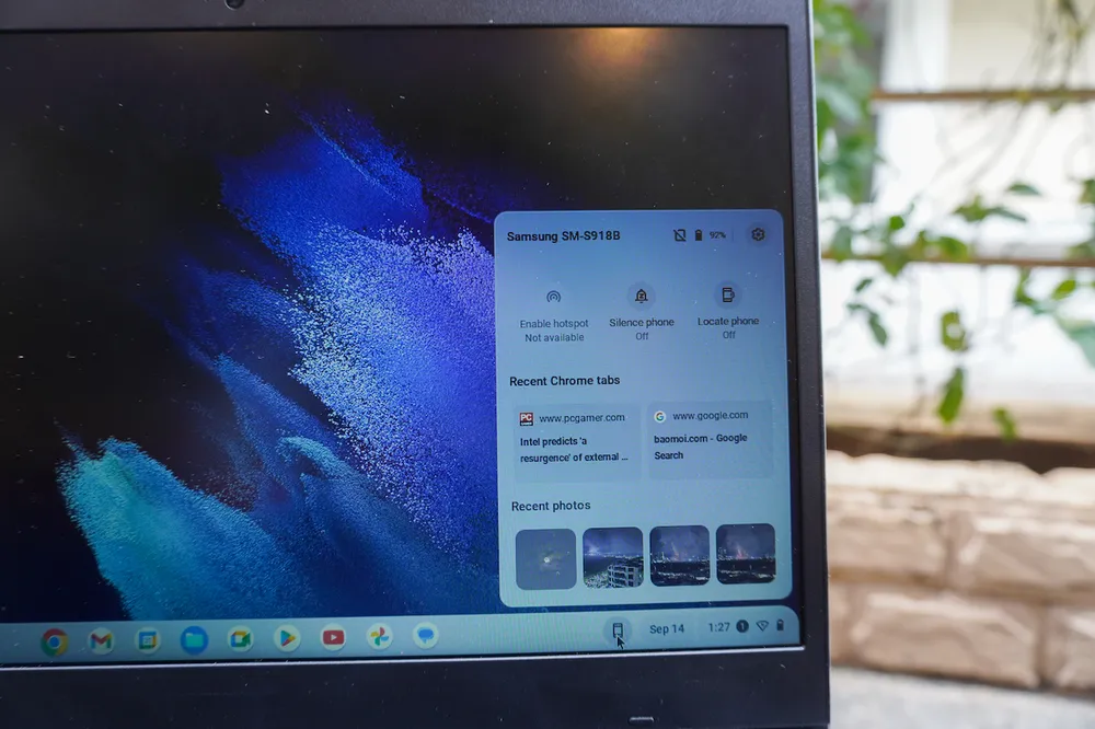 Là một sản phẩm của Samsung với hệ sinh thái mạnh mẽ, Galaxy Chromebook Go hỗ trợ rất tốt các nền tảng của nhà sản xuất này. Nếu sử dụng điện thoại Android, chúng ta có thể mở khóa máy tính bằng điện thoại, hay dùng Phone Hub để quản lý không dây, lấy trực tiếp những hình ảnh chụp bằng điện thoại lên máy tính để dễ dàng sử dụng.