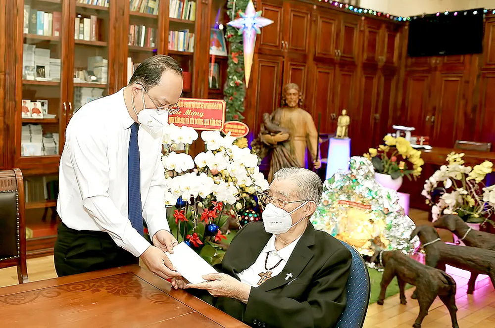 Phó Bí thư Thành ủy TPHCM Nguyễn Hồ Hải thăm, chúc mừng Hồng y Phạm Minh Mẫn. Ảnh: DŨNG PHƯƠNGTrân trọng cảm ơn những đóng góp của Hồng y Phạm Minh Mẫn cùng bà con giáo dân, đồng chí Nguyễn Hồ Hải gửi lời chúc Hồng y sức khỏe, bình an. Thông qua Hồng y, đồng chí gửi lời chúc đến đồng bào giáo dân một mùa Giáng sinh an lành, hạnh phúc. Phó Bí thư Thành ủy TPHCM Nguyễn Hồ Hải cho biết, năm 2021 là năm TPHCM phải đối diện nhiều khó khăn trước làn sóng dịch Covid-19 lần thứ 4. Thành phố cố gắng kiểm soát được dịch bệnh, nhưng tổn thất vô cùng to lớn. Để đảm bảo tính mạng, sức khỏe, cuộc sống của người dân, cả nước đã chung tay hỗ trợ TPHCM, trong đó có sự đóng góp của bà con giáo dân.