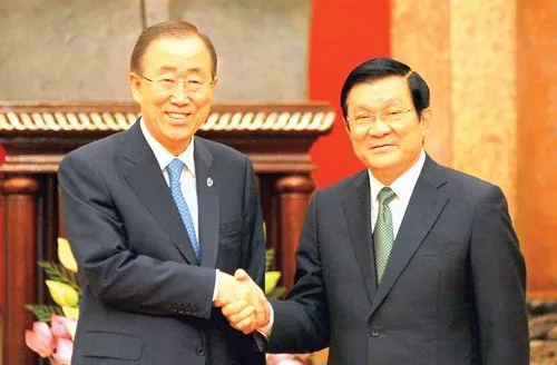 (SGGP).- Chiều 22-5, tại buổi tiếp diễn ra ngay sau lễ đón chính thức Tổng Thư ký Liên hiệp quốc (LHQ) Ban Ki-moon tại Phủ Chủ tịch, Chủ tịch nước Trương Tấn Sang và Tổng Thư ký LHQ Ban Ki-moon vui mừng nhận thấy quan hệ Việt Nam - LHQ đã có những bước phát triển mạnh mẽ.