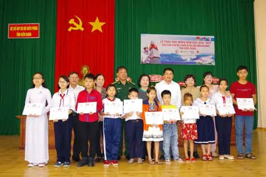 Các em học sinh là con em cán bộ Bộ đội Biên phòng tỉnh Kiên Giang nhận học bổng Vừ A Dính