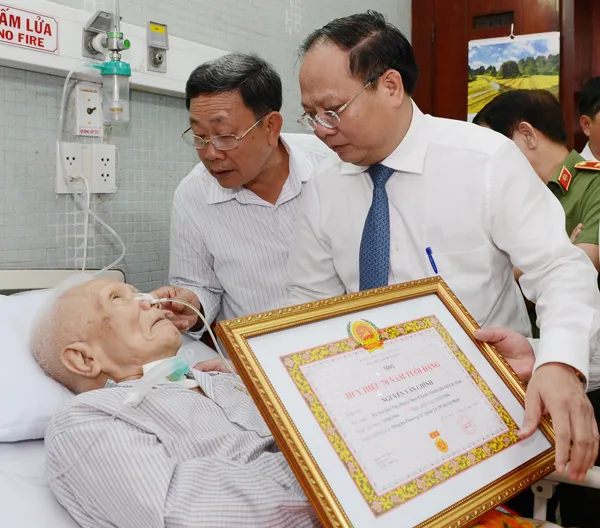 Phó Bí thư Thường trực Thành ủy TPHCM Tất Thành Cang trao huy hiệu 70 năm tuổi Đảng cho đồng chí Nguyễn Văn Chính. Ảnh: Việt Dũng