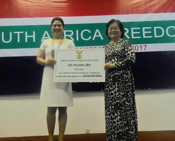 Bà Trương Mỹ Hoa, nguyên Phó Chủ tịch nước, Chủ tịch Quỹ học bổng Vừ A Dính, Chủ nhiệm CLB "vì Hoàng Sa - Trường Sa thân yêu" nhận tài trợ từ đại diện Lãnh sự quán Nam Phi.