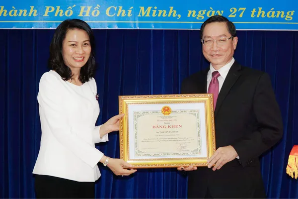 Phó Chủ tịch UBND TPHCM Nguyễn Thị Thu trao Bằng khen cho Giám đốc Sở Y tế TPHCM Nguyễn Tấn Bỉnh. Ảnh: Hoàng Hùng