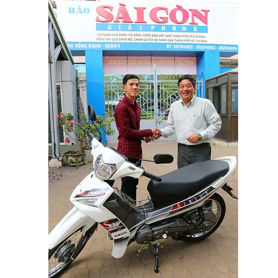 Chiều 27-1, ông Hà Nam Giang, Chánh văn phòng Báo Sài Gòn Giải Phóng, đại diện Ban tổ chức trận đấu giao hữu giữa B.Bình Dương và SCG Muangthong United đã trao giải thưởng chiếc xe máy cho khán giả Huỳnh Văn Đoàn (ảnh, bên trái).