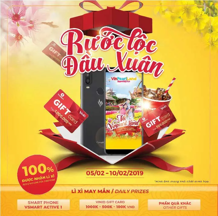 Và cuối cùng, không thể bỏ qua phong tục chơi xuân – rước lộc vô cùng hấp dẫn tại cây ước nguyện ở từng điểm đến Vinpearl Land và Vinpearl Safari mỗi ngày. Từ ngày mồng 1 đến mồng 6 Tết, mỗi du khách của Vinpearl Land đến vui chơi tại Nha Trang, Phú Quốc và Hội An sẽ tham gia hái lộc – đổi lì xì và tham gia rút thăm trúng thưởng với hàng trăm phần quà giá trị chỉ có tại Vinpearl Land. Mỗi ngày, du khách ở mỗi cơ sở Vinpearl Land sẽ có cơ hội nhận được điện thoại Vsmart Active 1; thẻ VinID GiftCard trị giá 100.000 đồng; 500.000 đồng và 1 triệu đồng. Bên cạnh đó, hệ thống nhà hàng Vinpearl Land luôn có lì xì voucher ẩm thực hấp dẫn đến mỗi du khách sở hữu hóa đơn từ 100.000 đồng trở lên cùng nhiều phần quà may mắn khác.