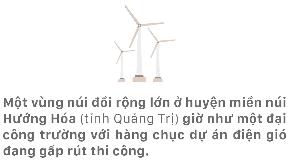 Một vùng núi đồi rộng lớn ở huyện miền núi Hướng Hóa (tỉnh Quảng Trị) giờ như một đại công trường với hàng chục dự án điện gió đang gấp rút thi công.