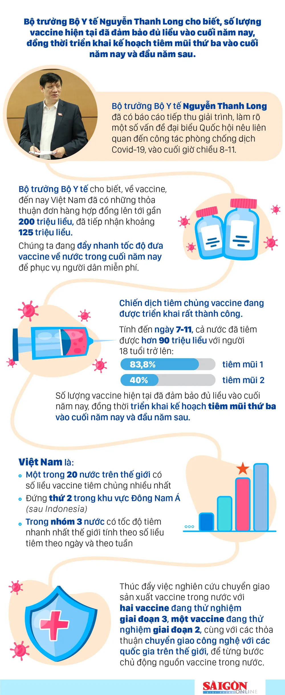 Bộ trưởng Bộ Y tế Nguyễn Thanh Long cho biết, số lượng vaccine hiện tại đã đảm bảo đủ liều vào cuối năm nay, đồng thời triển khai kế hoạch tiêm mũi thứ ba vào cuối năm nay và đầu năm sau.