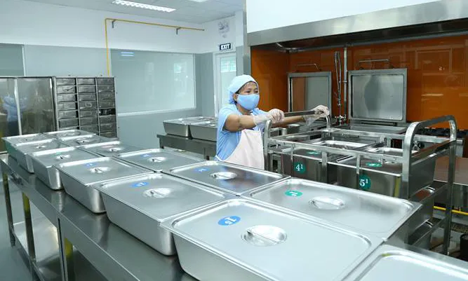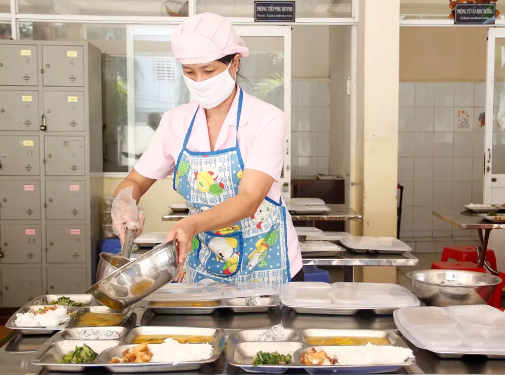 Bộ phận bếp bán trú tại Trường Tiểu học Phan Đình Phùng – TPHCM chuẩn bị bữa trưa cho các em học sinh theo thực đơn của phần mềm