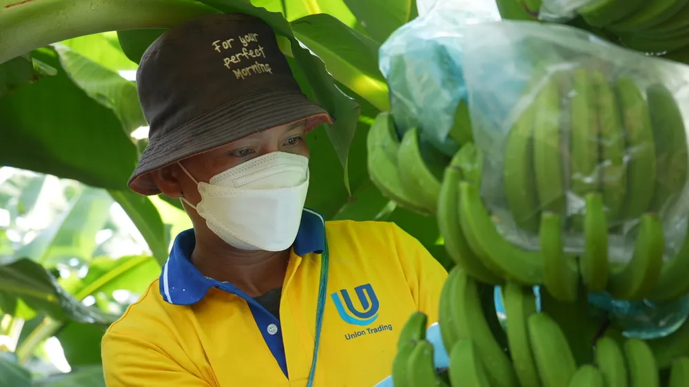 Ông Đỗ Hữu Dự, Trưởng Ban quản lý nông trại của Union Trading tại Bình Phước cho biết, hiện nông trại chuyên canh chuối già Nam Mỹ tại Bình Phước của Union Trading có diện tích 150ha. Công ty còn liên kết, hợp tác để mở rộng mạng lưới các nông trại đối tác chiến lược rộng khắp tại: Củ Chi (TPHCM), An Giang, Quảng Ngãi… với tổng diện tích lên đến 500ha. Công ty xây dựng một quy trình chặt chẽ từ nhân giống, cấy mô đến sản xuất, sử dụng hệ thống tưới nhỏ giọt tự động của Israel giúp tiết kiệm nguồn nước tưới, hạn chế cỏ dại, giảm công chăm sóc, hệ thống châm phân tự động, chủ yếu sử dụng phân hữu cơ sinh học, nhỏ giọt của Israel. Các cây chuối được “gia cố” cẩn thận để cây không bị ngã đổ, đảm bảo năng suất, từng buồng chuối được chăm sóc kỹ lưỡng từ các công việc bẻ hoa, chèn nải, bao buồng. Buồng chuối sau khi cắt được vận chuyển bởi hệ thống ròng rọc để đảm bảo không bị va đập làm dập, đưa đến khu phân xưởng sơ chế, phân loại. Tại đây, chuối được vệ sinh sạch sẽ bởi các giàn phun và bể xử lý. Tiếp đến, các nải chuối được cân để đảm bảo kích thước và trọng lượng đồng đều, rồi làm khô ráo trước khi đóng gói. Chuối được đóng nguyên nải trong thùng carton loại 13kg, lót mút xốp, sau đó được ủ, bảo quản lạnh trong kho tiêu chuẩn. Từ kho này, chuối sẽ được vận chuyển đi phân phối, tiêu thụ ngoài thị trường.
