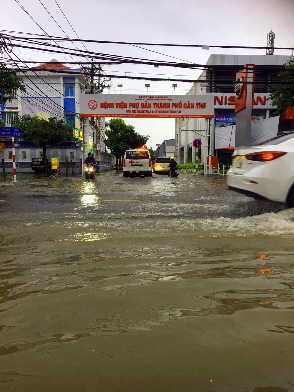 Nước dâng cao, nhiều con hẻm ngập trên 0,5m. Trong ảnh: Nước "bủa vây"  quanh một bệnh viện tại Cần Thơ sáng 17-10