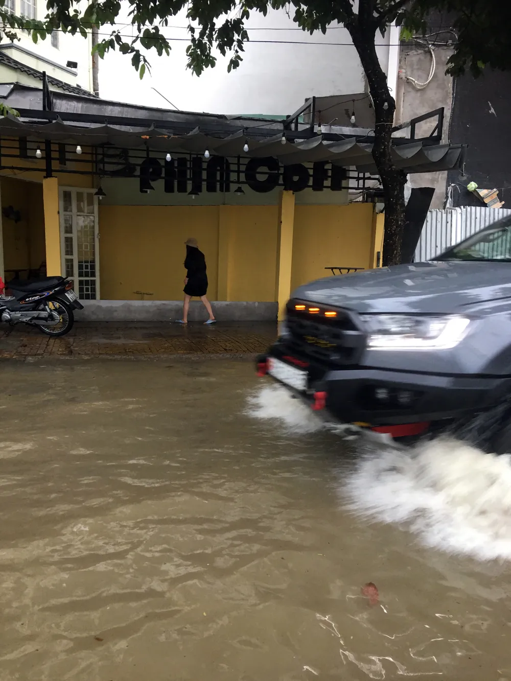 Đường Huỳnh Cương ngập nghiêm trọng - một quán cà phê phải xây tường ngăn nước tràn vào quán