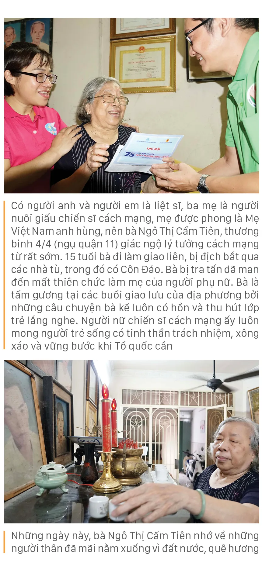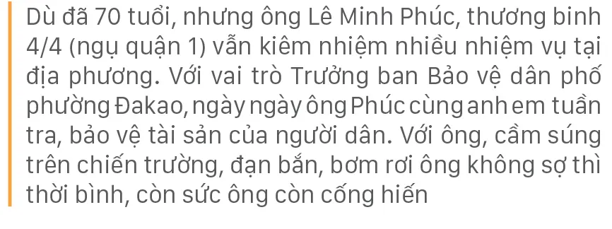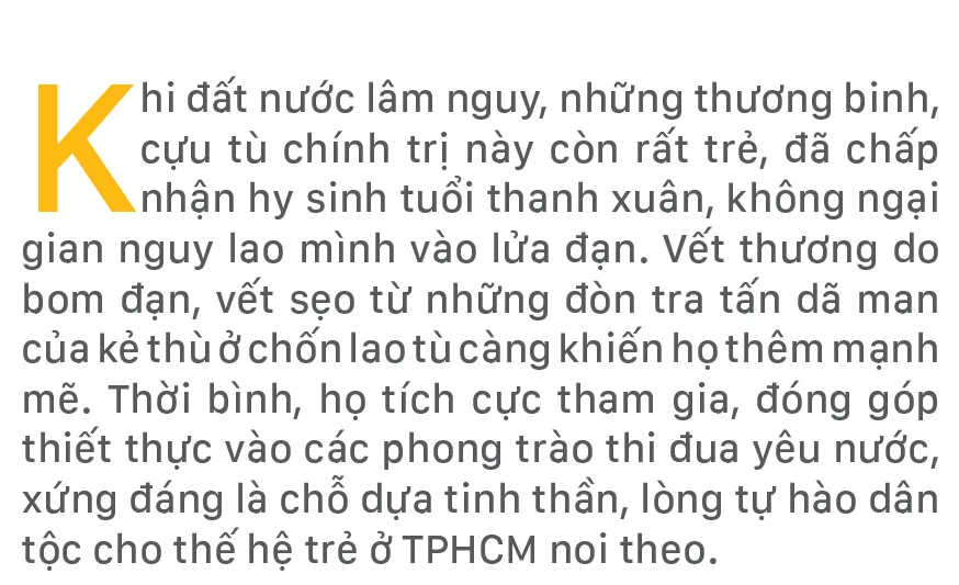 Khi đất nước lâm nguy, những thương binh, cựu tù chính trị này còn rất trẻ, đã chấp nhận hy sinh tuổi thanh xuân, không ngại gian nguy lao mình vào lửa đạn. Vết thương do bom đạn, vết sẹo từ những đòn tra tấn dã man của kẻ thù ở chốn lao tù càng khiến họ thêm mạnh mẽ. Thời bình, họ tích cực tham gia, đóng góp thiết thực vào các phong trào thi đua yêu nước, xứng đáng là chỗ dựa tinh thần, lòng tự hào dân tộc cho thế hệ trẻ ở TPHCM noi theo.