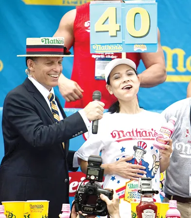 Đây là năm đầu tiên thí sinh nam và nữ thi riêng biệt. Về phía nữ, Sonya Thomas (44 tuổi) chiến thắng với 40 chiếc xúc xích cũng trong 10 phút (ảnh).