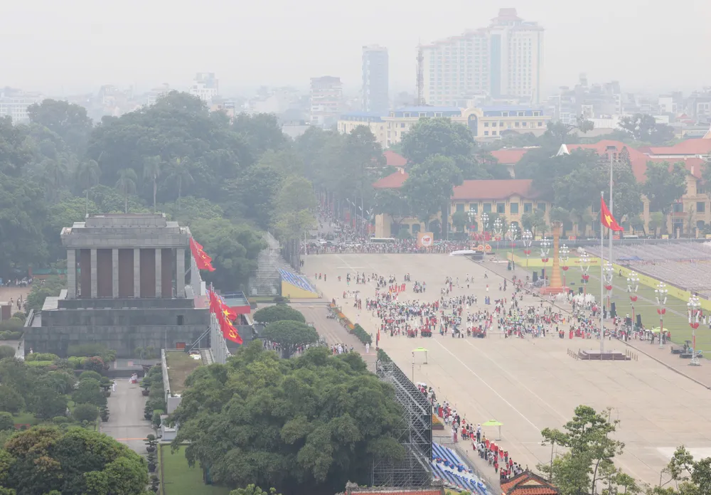 Tại khu vực Quảng trường Ba Đình, nhiều người dân hò reo khi thấy hàng chục máy bay vận tải, chiến đấu, xuất hiện trên bầu trời Hà Nội...