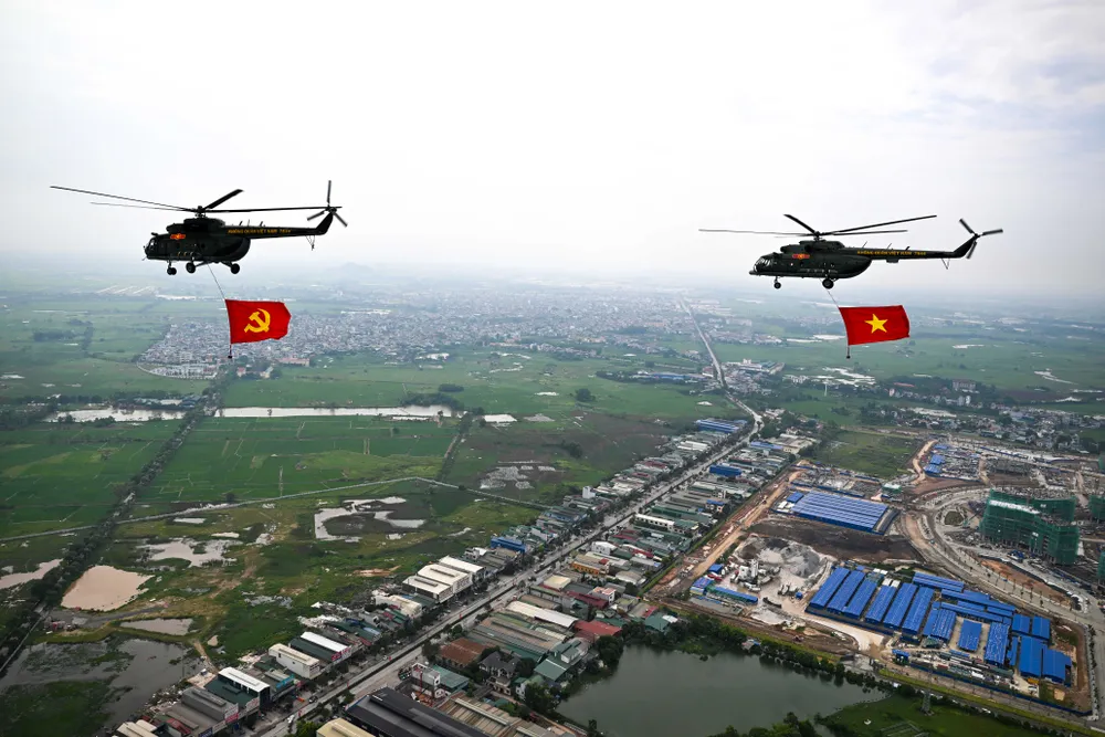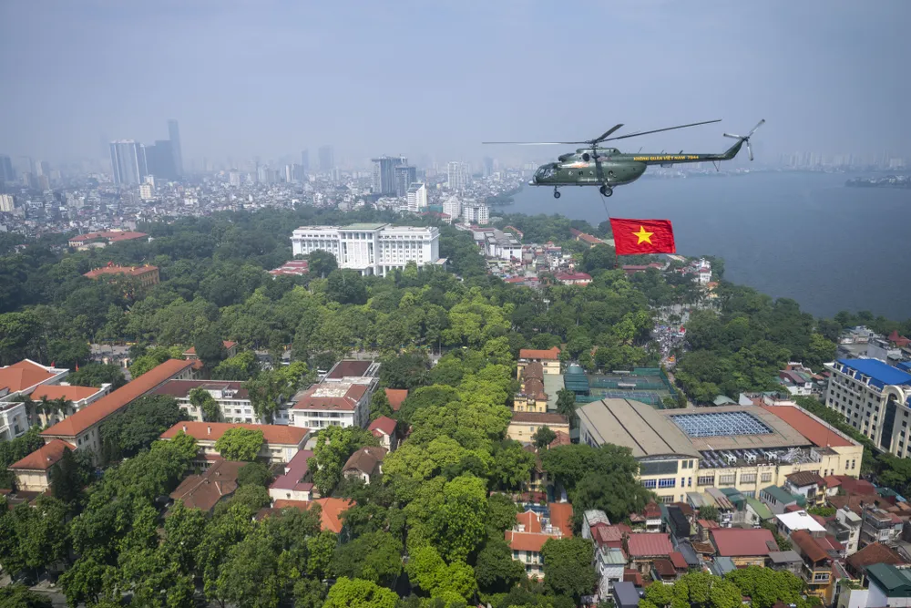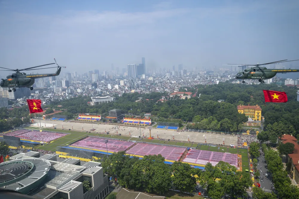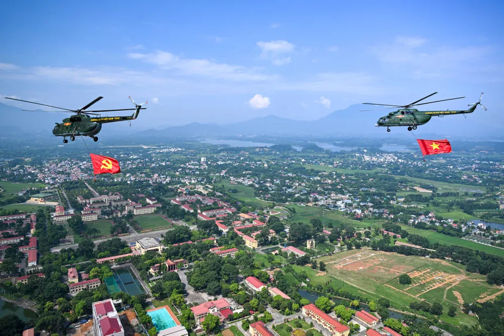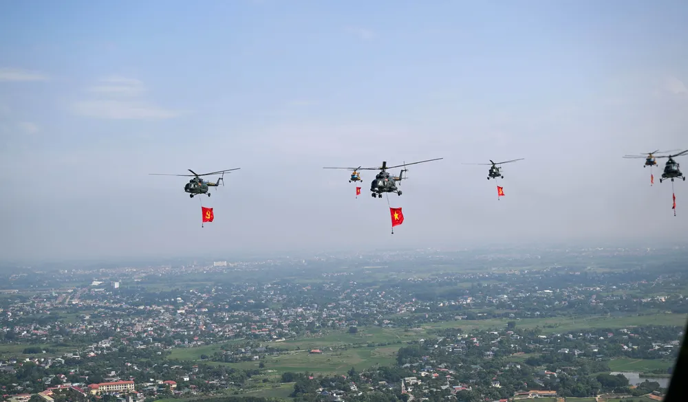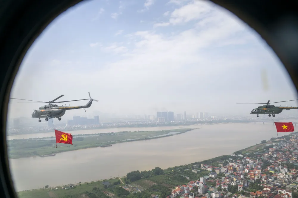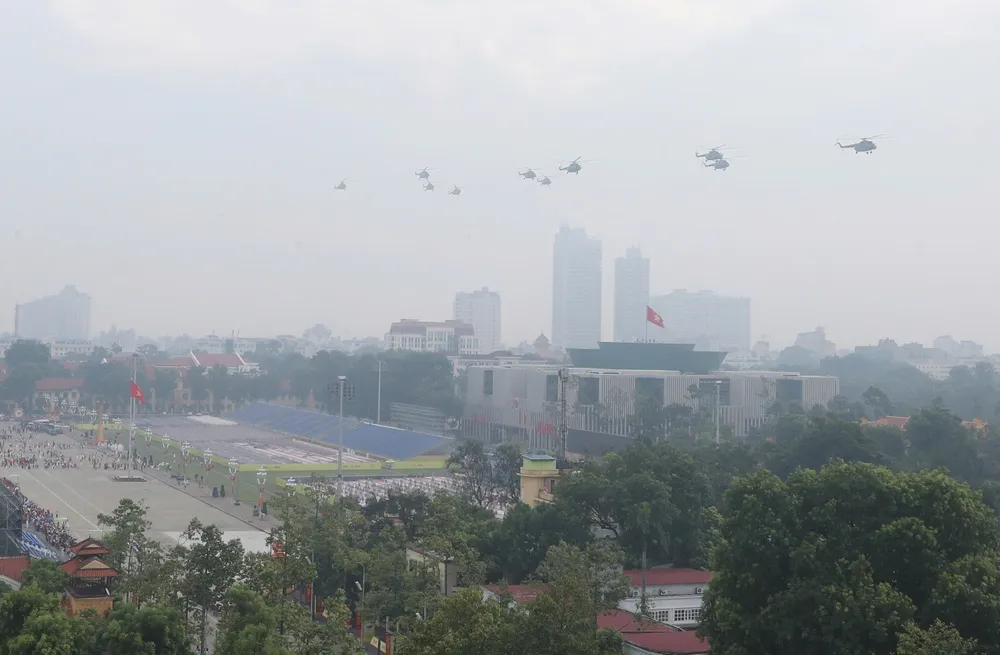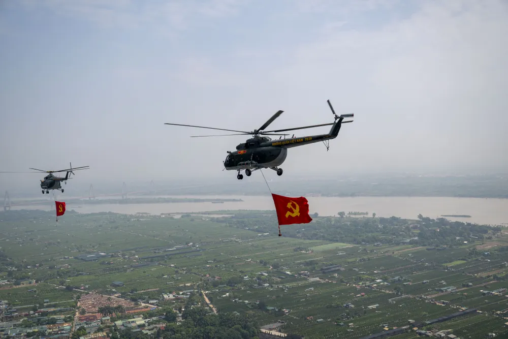 Trước đó, trong đợt cất cánh thứ 2 tại Sân bay Hòa Lạc lúc 9 giờ 35 phút, đội hình trực thăng mang theo cờ Tổ quốc, cờ Đảng hướng về Ba Đình.