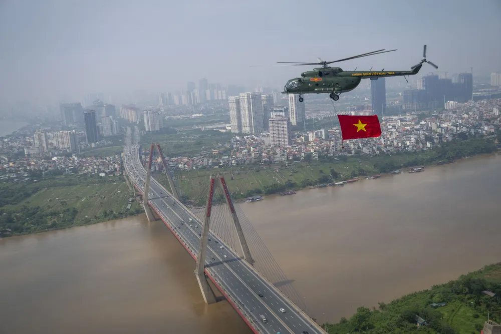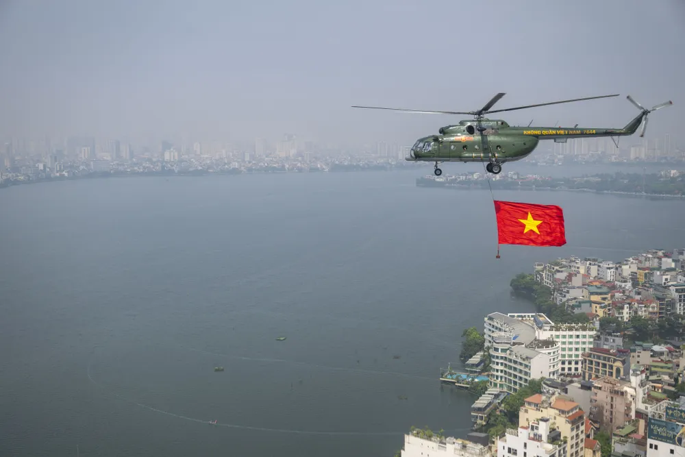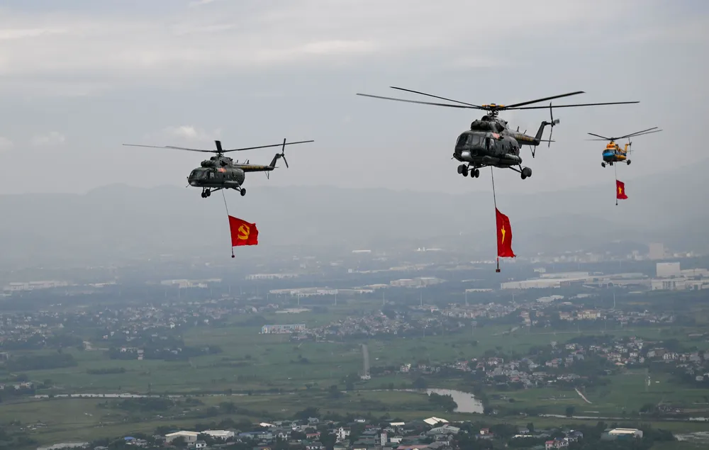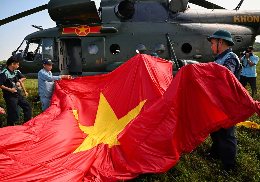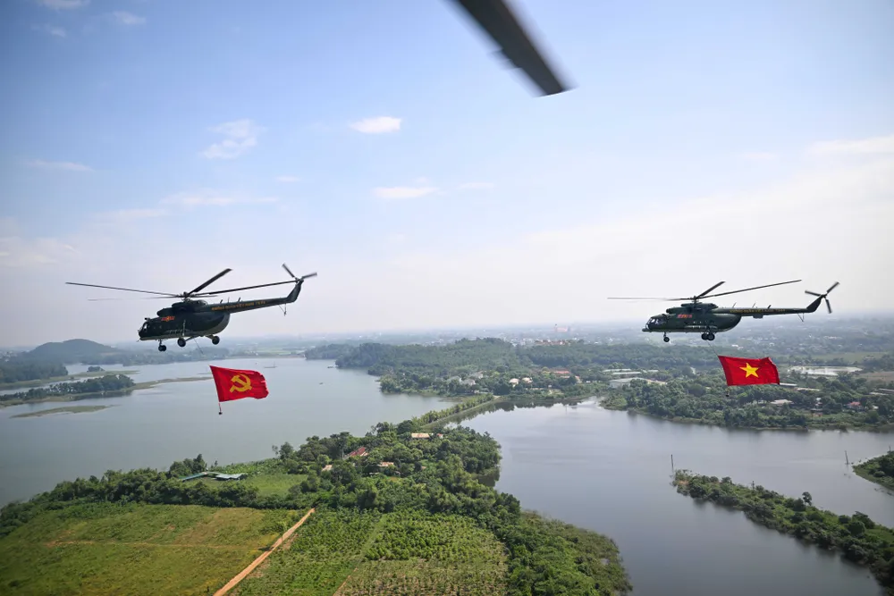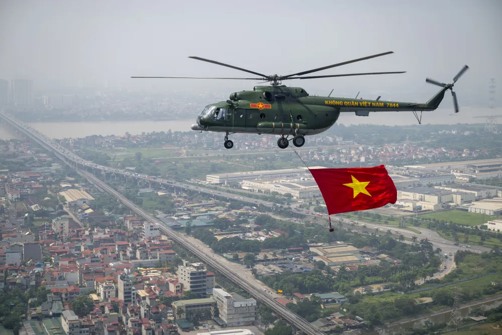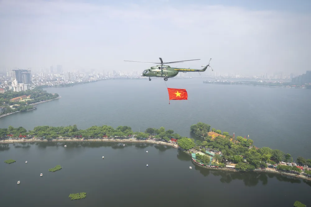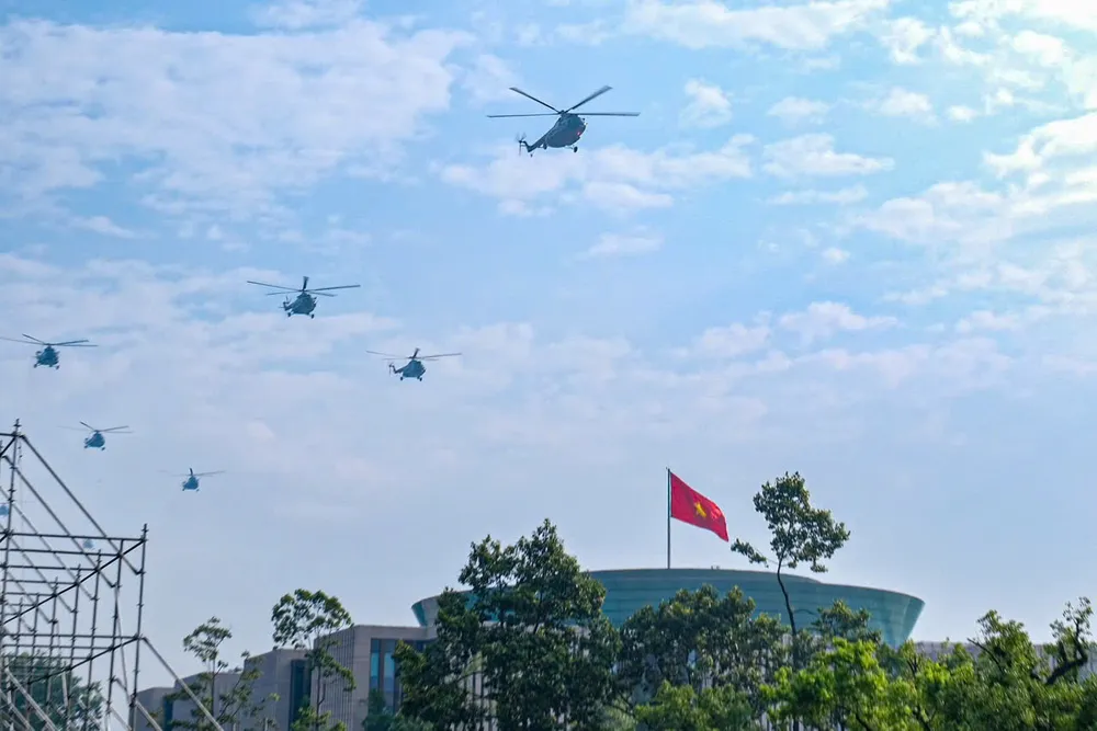 Trước đó, trong đợt cất cánh thứ 2 tại Sân bay Hòa Lạc lúc 9 giờ 35 phút, đội hình trực thăng mang theo cờ Tổ quốc, cờ Đảng hướng về Ba Đình.