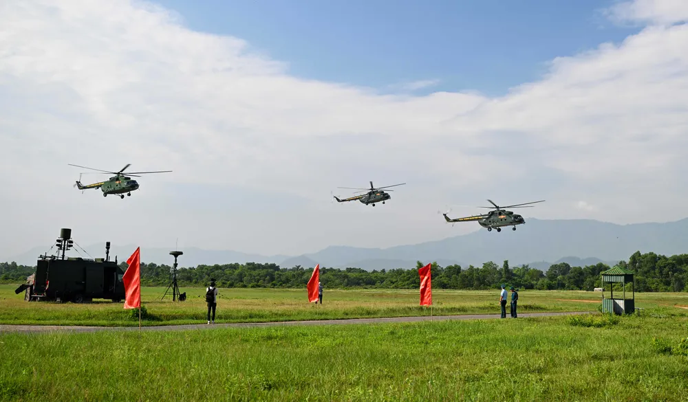 Đội hình các máy bay trực thăng bay kiểm tra, xếp đội hình tại sân bay Hòa Lạc