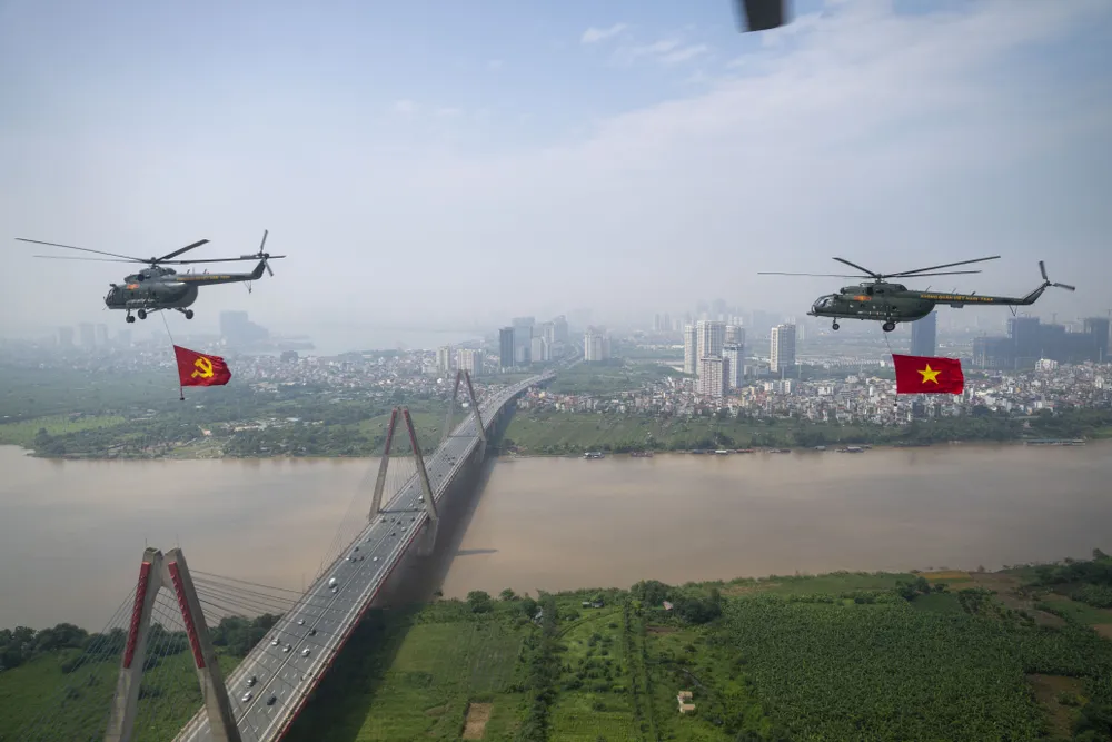>>> Đội hình trực thăng mang theo cờ Tổ quốc, cờ Đảng hướng về Ba Đình: