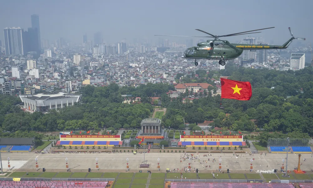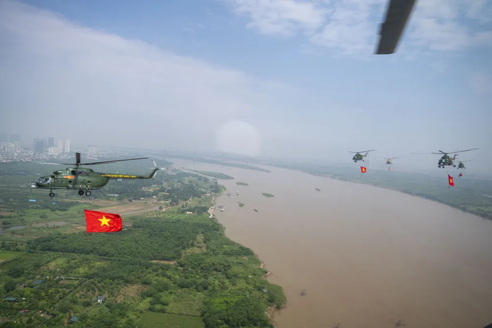 Tiếp đó, 10 máy bay với đội hình 1-3-3-3 cất cánh, sau khoảng 25 phút, vượt qua sông Hồng, 10 máy bay trực thăng về tới khu vực Quảng trường Ba Đình.