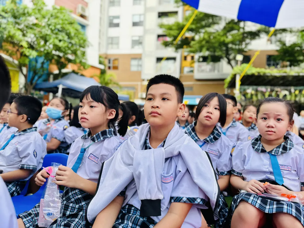 Các em học sinh dự khai giảng năm học mới tại Trường Tiểu học Lê Đức Thọ (quận Gò Vấp, TPHCM). Ảnh: CHÍ THẠCH |