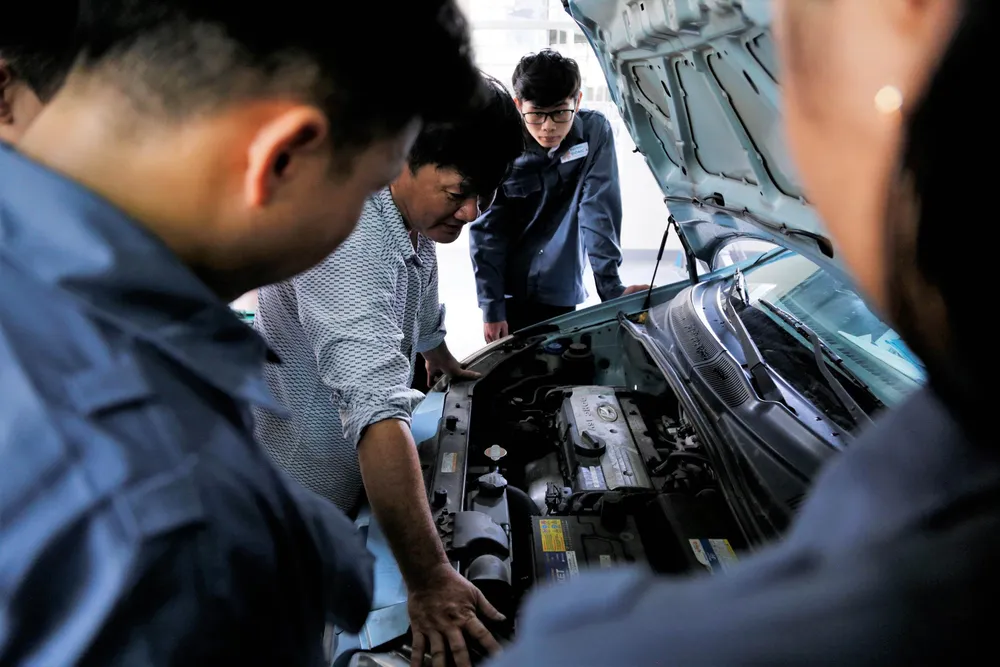 Các sinh viên đang thực hành sửa chữa động cơ ô tô