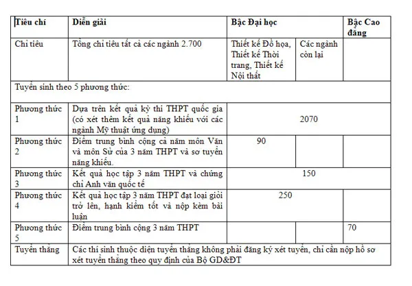 Trường sơ tuyển năng khiếu và xét tuyển trên kết quả học tập 3 năm THPT của môn Ngữ văn, Lịch sử (dành cho 3 ngành Thiết kế Thời trang, Đồ họa, và Nội thất); xét tuyển trên chứng chỉ Anh văn quốc tế và kết quả học tập 3 năm THPT; xét tuyển trên bài luận của học sinh giỏi 3 năm THPT; xt tuyển trên kết quả học tập 3 năm THPT và phỏng vấn, nếu có (dành cho các ngành Cao đẳng).