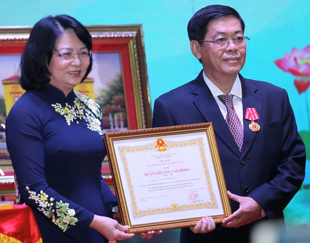 Phó Chủ tịch nước Đặng Thị Ngọc Thịnh tặng Huân chương Lao động hạng Nhì cho GS-TS Trần Thiện Trung, Trưởng khoa Điều dưỡng - Kỹ thuật Y học Trường ĐH Y dược TPHCM. Ảnh: HOÀNG HÙNG