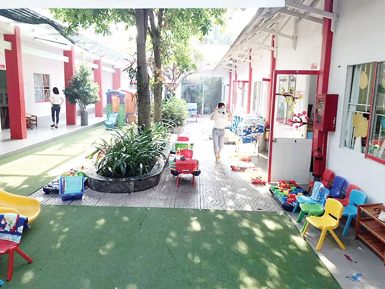 Khử khuẩn lớp hàng ngày bằng Cloramin-B/Javel/Xà phòng. Vào mỗi buổi chiều đều cho các lớp rửa sạch đồ chơi, đồ dùng của trẻ bằng dung dịch Cloramin-B/Javel/Xà phòng để đảm bảo vệ sinh tuyệt đối. Sát khuẩn các tay nắm cửa, tay vịn toilet của trường 02 tiếng/lần. Vệ sinh và khử khuẩn khu vực ngoài lớp học: Nhân viên thường xuyên vệ sinh, sát khuẩn các đồ dùng, đồ chơi bên ngoài để đảm bảo vệ sinh tuyệt đối cho trẻ 03 lần/ngày (đầu giờ sáng - buổi trưa - đầu giờ chiều). Bếp ăn Cấp dưỡng và phụ bếp phải đeo khẩu trang, bao tay đúng chuẩn của Bộ Y tế trong suốt quá trình chế biến thực phẩm. Luôn giữ lớp học thông thoáng, mở cửa sổ để lấy ánh sáng, gió trời và khí tươi. Hạn chế sử dụng máy lạnh nếu thời tiết không quá nóng và luôn giữ mức nhiệt độ phòng.