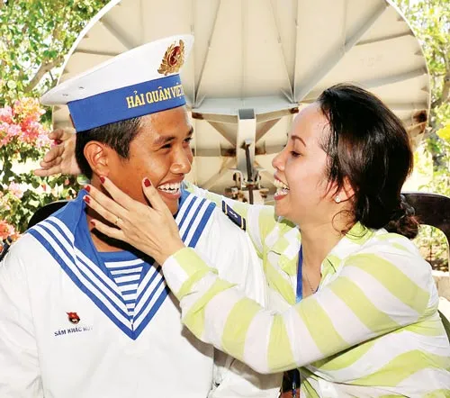 Niềm vui ngày gặp mặt của mẹ Đào Thị Hồng Hoa khi đến thăm con là chiến sĩ Sầm Khắc Huy đang làm nhiệm vụ tại đảo Song Tử Tây