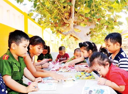 Các em thiếu nhi tại đảo Song Tử Tây vẽ tranh, tô màu do Thành đoàn TNCS TPHCM tặng