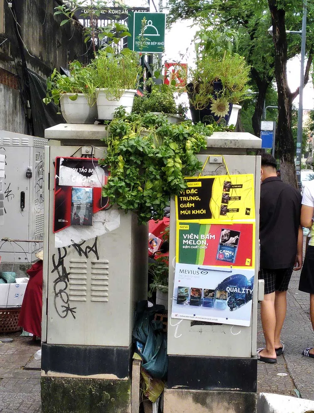 Dù đã có biển cảnh báo “Có điện - Nguy hiểm chết người”, tuy nhiên vẫn có người biến tủ điện thành kệ, đặt những chậu cây kiểng trên đó. Ảnh chụp trên đường Lý Tự Trọng (phường Bến Nghé, quận 1, TPHCM).