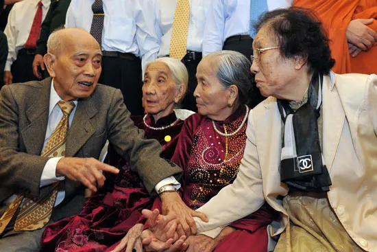 Nguyên Phó Chủ tịch nước Nguyễn Thị Bình (bìa phải) và các đại biểu trong buổi họp mặt các nhân chứng tham gia Hội nghị Paris về Việt Nam. Ảnh: Việt Dũng