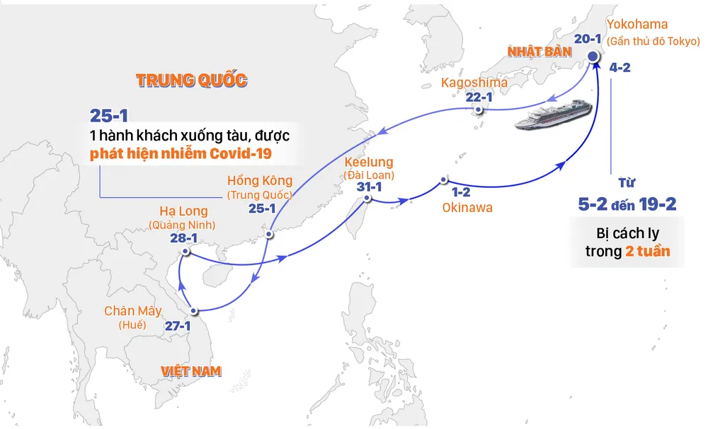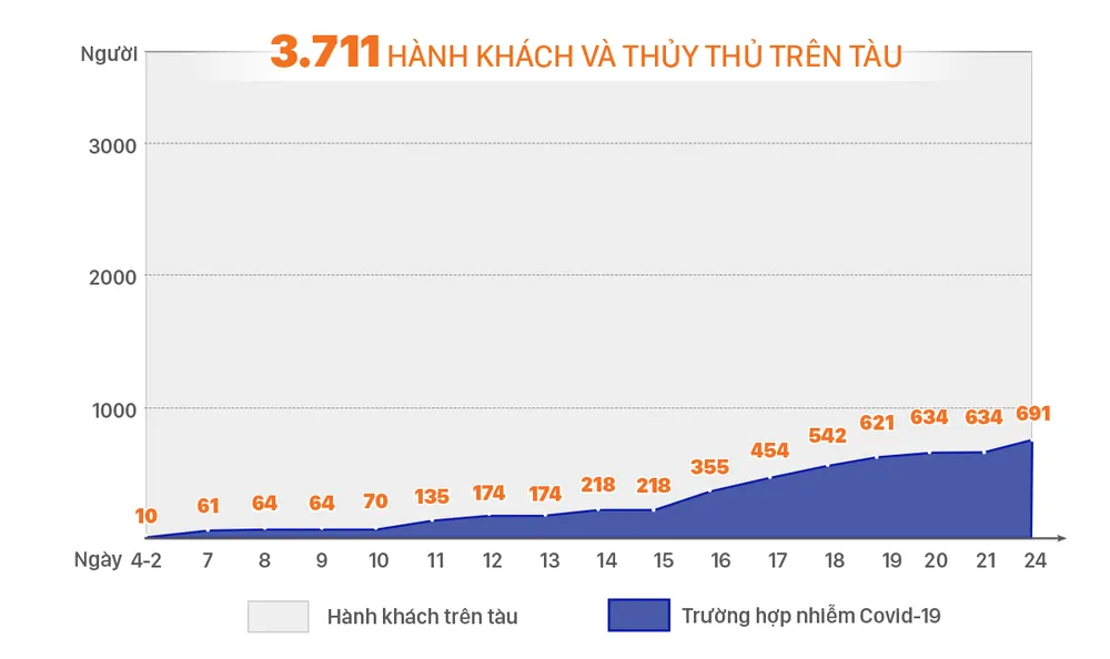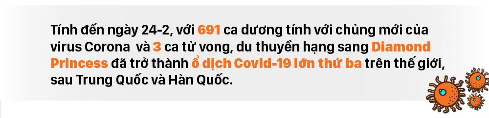 Tính đến ngày 24-2, với 691 ca dương tính với chủng mới của virus Corona và 3 ca tử vong, du thuyền hạng sang Diamond Princess đã trở thành "ổ dịch" Covid-19 lớn thứ ba trên thế giới, sau Trung Quốc và Hàn Quốc.