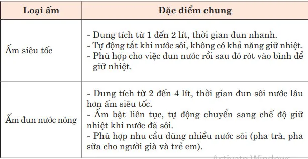 Hiện nay, trên thị trường, ngoài ấm đun nước siêu tốc còn có ấm đun nước nóng và ấm đun không có bộ phận gia nhiệt. Bảng sau đây đưa ra các so sánh cơ bản giữa các loại ấm đun nước khác nhau: