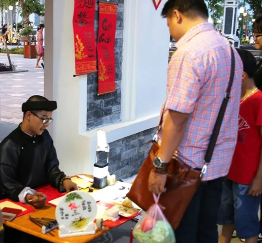 Khách đến du xuân ở Asia Park còn tranh thủ xin chữ đầu năm. Đây vốn là nét đẹp văn hóa không thể thiếu trong dịp Tết cổ truyền của người Việt.